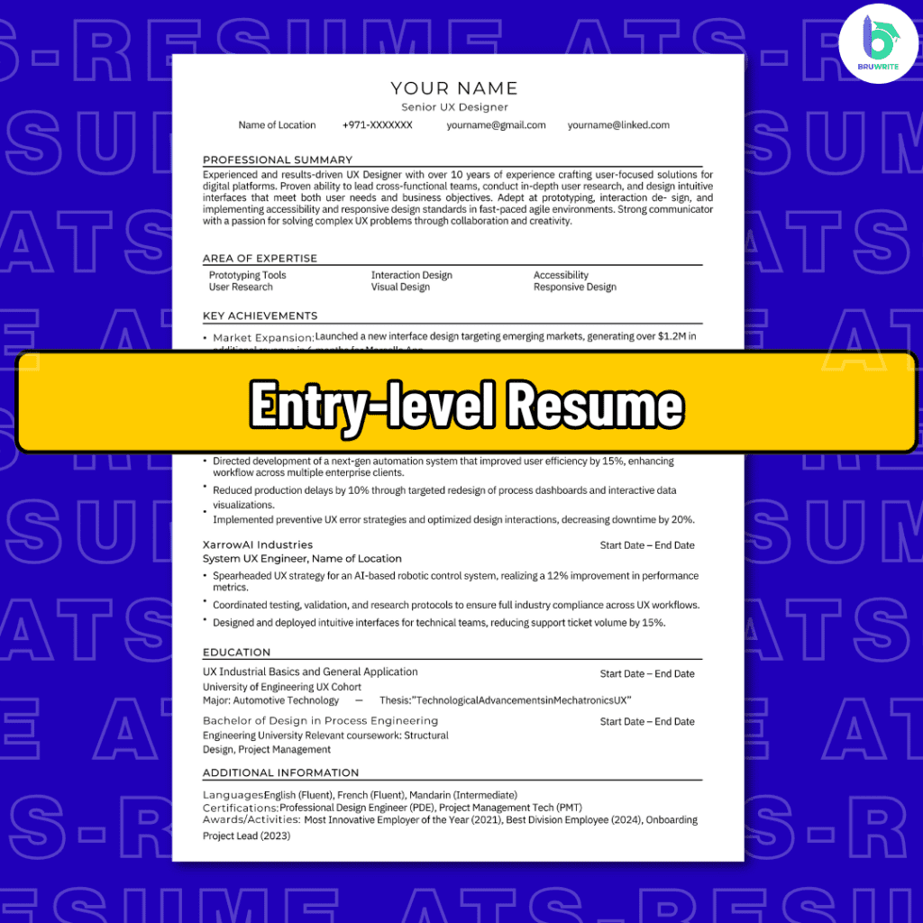- Cover Letter: Available as an add-on for entry-level resumes.